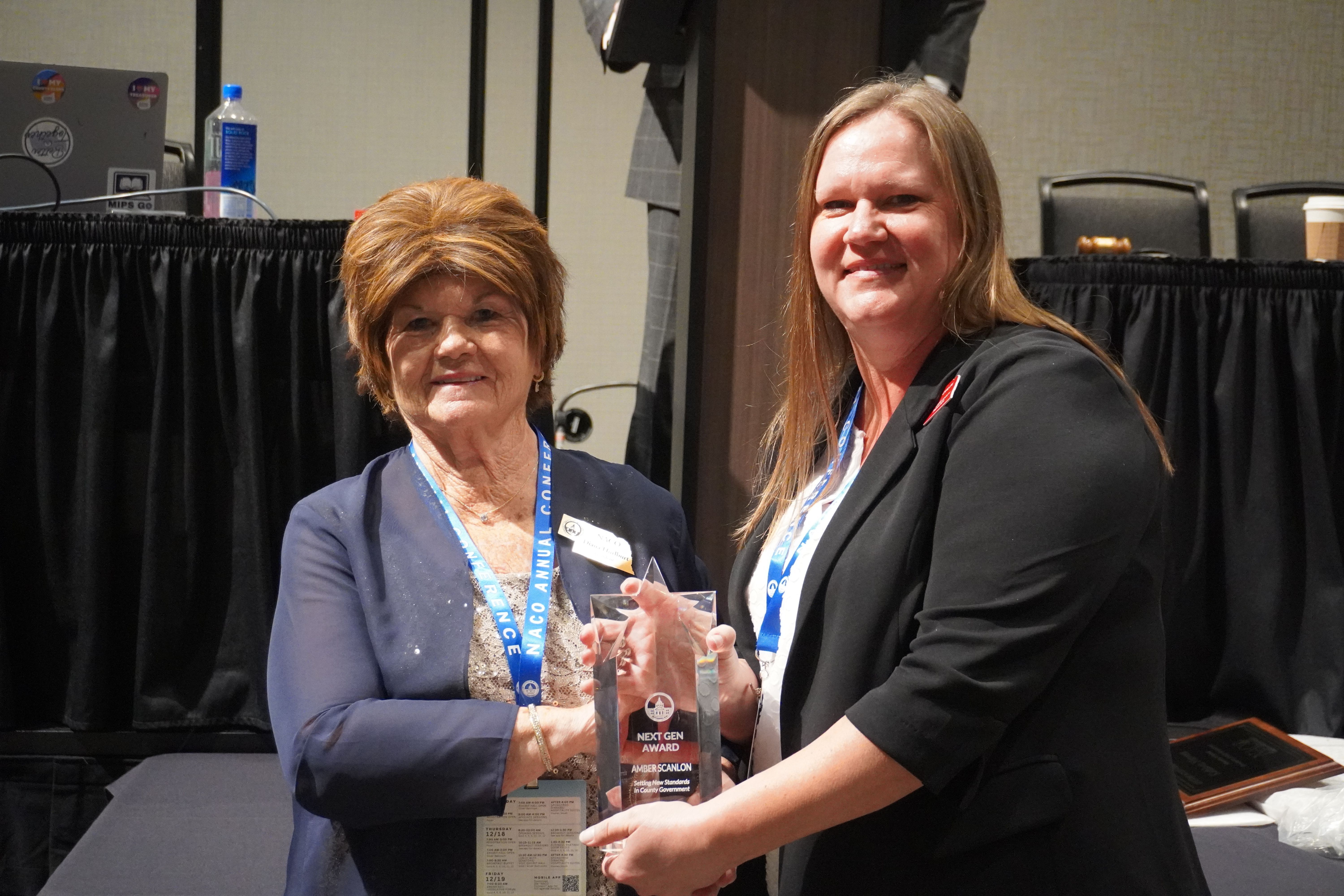 Saunders County Treasurer Amber Scanlon receives the 2025 Next Generation Award from NACO President Diana Hurlburt.
