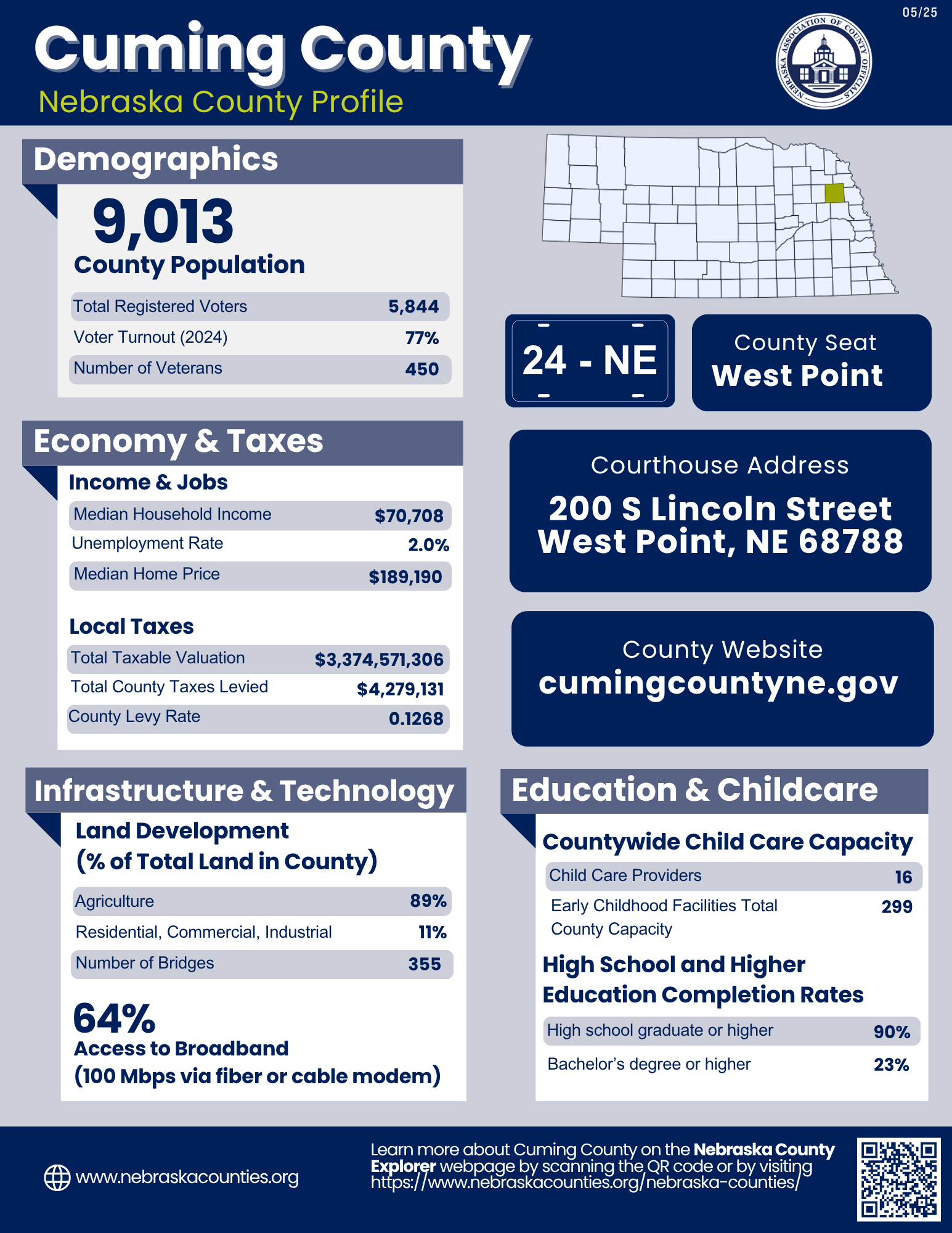 For more information about the Cuming County programs, please contact David Branch, the Director of Cuming County Economic Development, at (402) 372-6001 or via email.