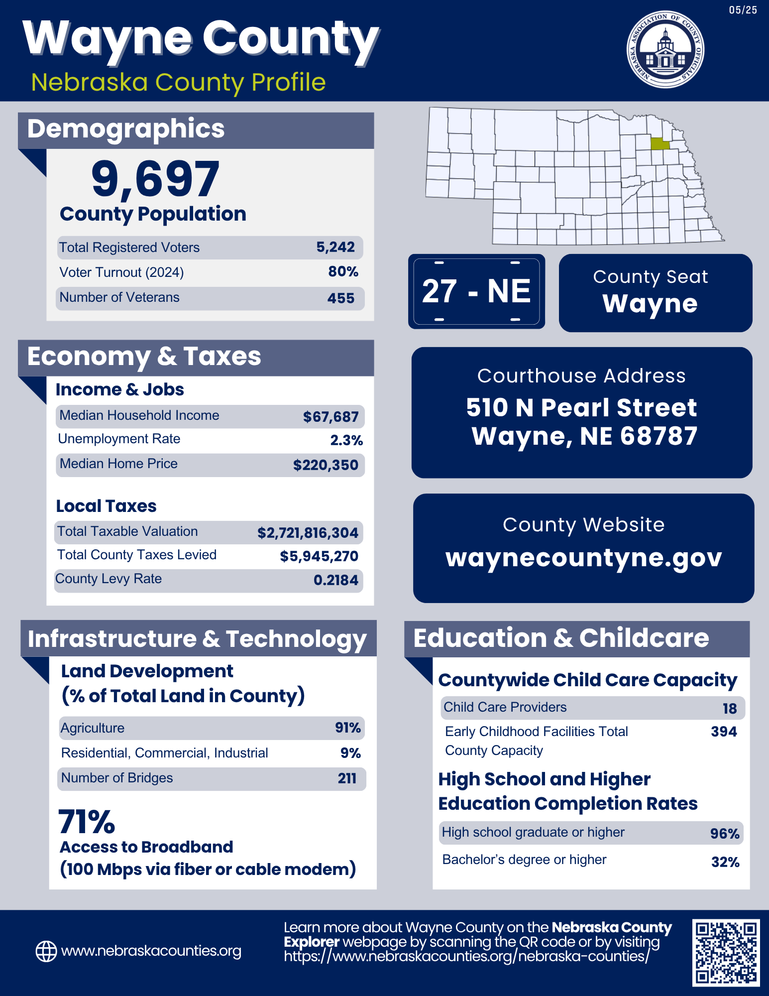 - Cities (pop. & class): Wakefield (1,522 • 2nd Class), Wayne (5,973 • 2nd Class)